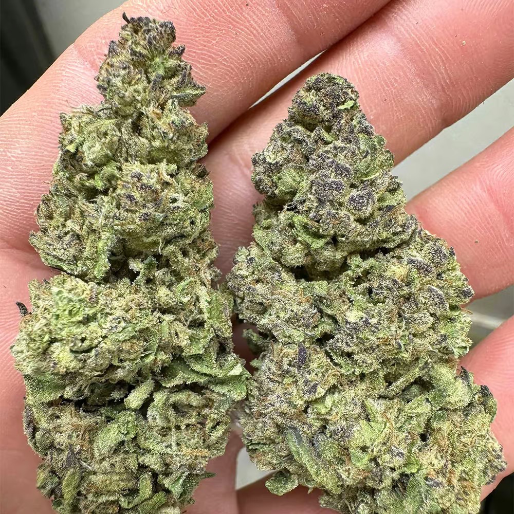 This bud doesn’t just taste and smell amazing—it’s a beauty too! Expect oversized, tree-shaped nugs that are minty green with fiery orange hairs, all covered in a frosty layer of white crystal trichomes. It’s like each nug was dipped in sugar, sparkling and ready to impress.